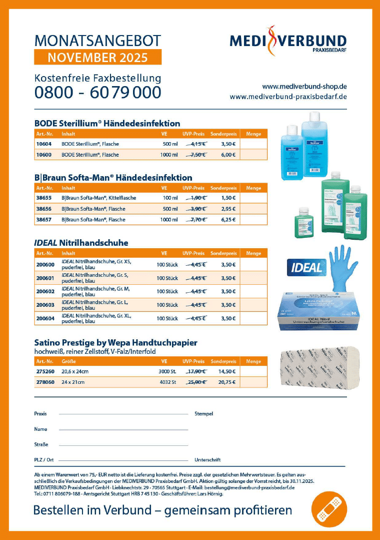 Kostenfreie Lieferung ab 75 € netto, die Bestellübersicht und der aktuelle Status Ihrer Bestellung sind jederzeit einsehbar und die Abrechnung erfolgt immer zu günstigen AEP. Sie haben noch Fragen? Wir sind unter info@mediverbund-praxisbedarf.de für Sie erreichbar.