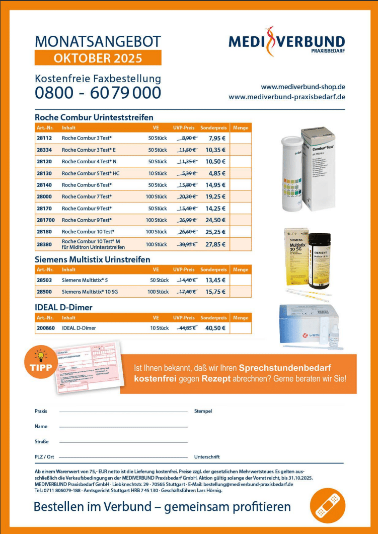 Auf dieser Seite finden Sie jeden Monat unser Praxisbedarf-Angebot für MEDI-Mitglieder. Für Fragen stehen wir Ihnen gerne zur Verfügung. Ihre Ansprechpartnerin Cevahir Sanli erreichen Sie telefonisch unter 0711 806079-123, per E-Mail unter cevahir.sanli@medi-verbund.de oder nutzen Sie das unten stehende Kontaktformular.